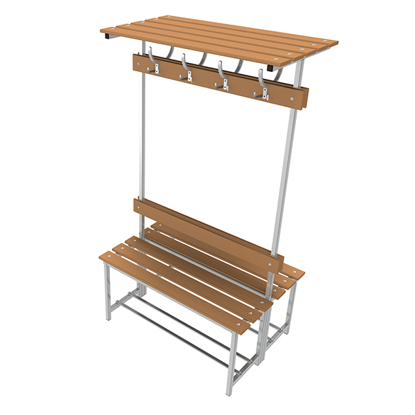 Banco con estructura metálica y lamas de madera. Solución robusta y cálida para vestuarios y zonas de descanso en espacios colectivos.