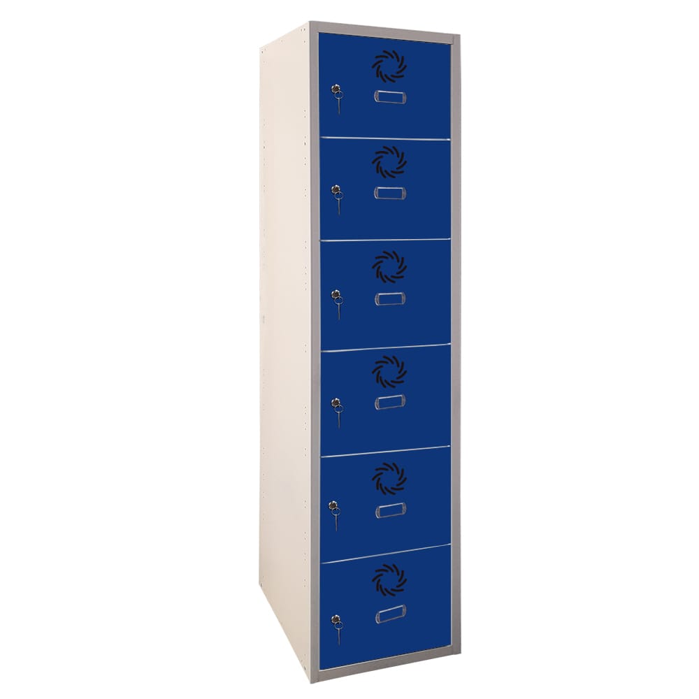 Taquilla metálica de 1 cuerpo, 6 puertas y 400 mm de anchura por columna. Fabricada en acero reciclable, combina resistencia, funcionalidad y sostenibilidad para un uso intensivo.