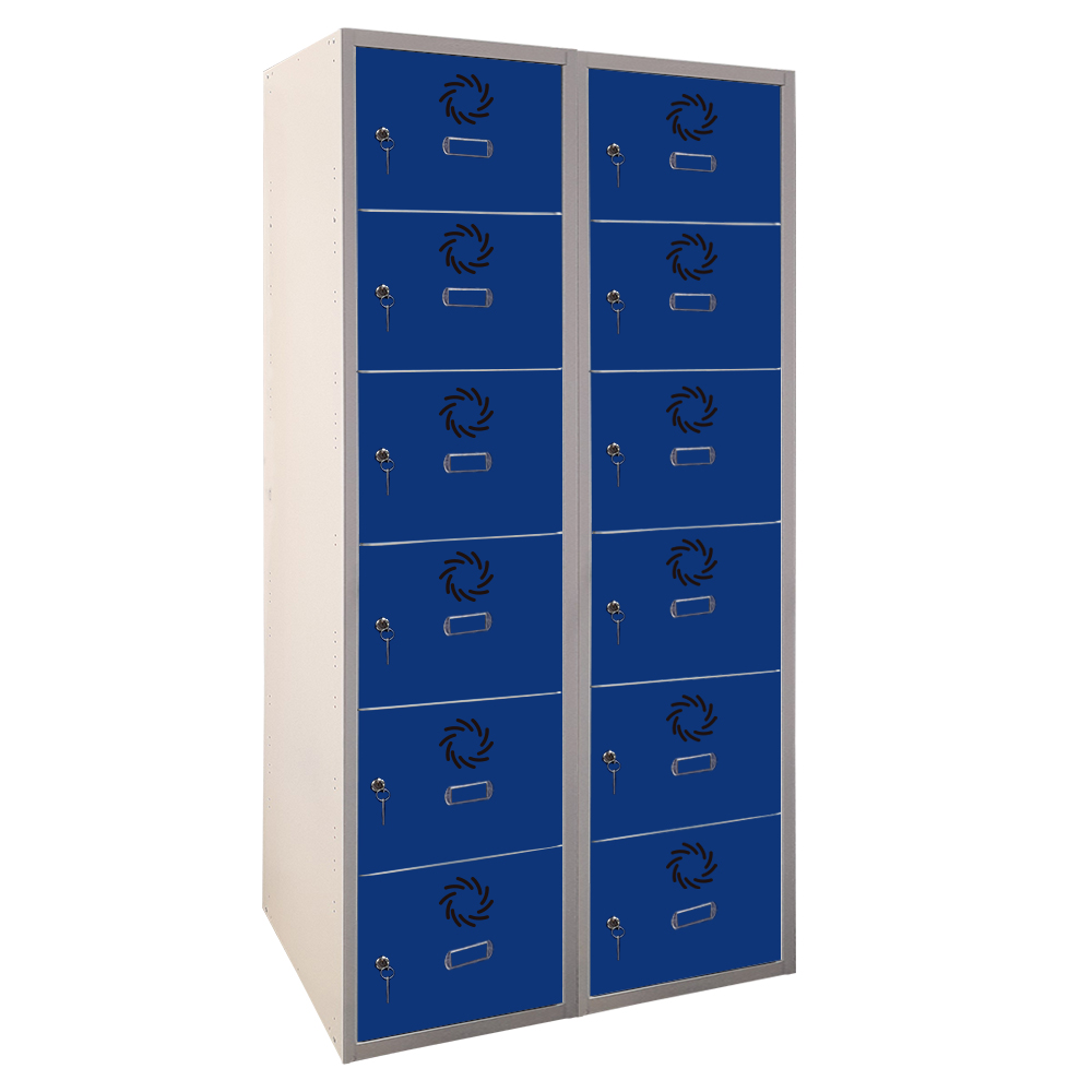 Taquilla metálica de 2 cuerpos, 6 puertas y 400 mm de anchura por columna. Fabricada en acero reciclable, combina resistencia, funcionalidad y sostenibilidad para un uso intensivo.