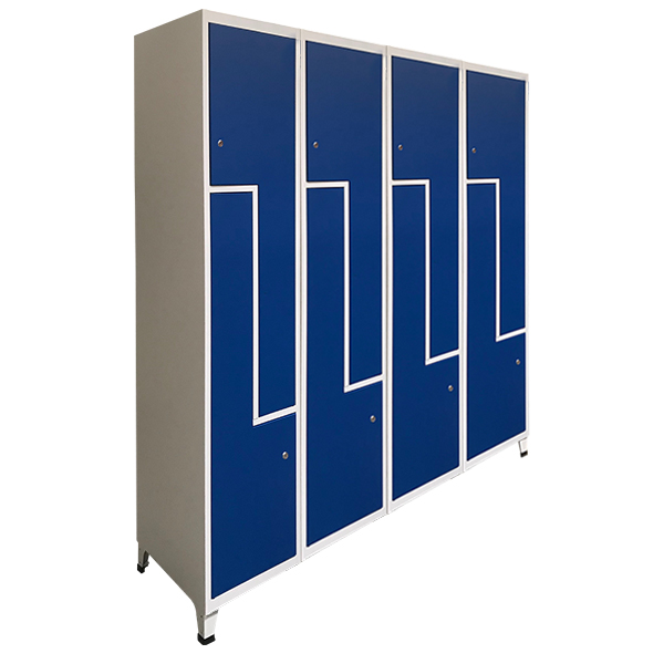 Taquilla metálica soldada de 4 cuerpos, 2 puertas en L y 300 mm de anchura por columna. Fabricada en acero reciclable, combina resistencia, funcionalidad y sostenibilidad para un uso intensivo.
