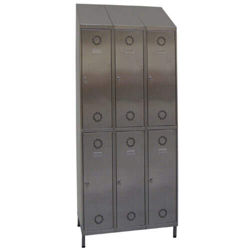 Las taquillas de acero inoxidable que podrás encontrar en Mobenka son de estructura soldada y se suministran montadas. Están disponibles en columnas de 1 y de 2 puertas por columna e incluyen patas y sobretecho inclinado de manera estándar. Y cuentan con una roseta de ventilación en la puerta que ayuda a mantener la taquilla en las mejores condiciones..